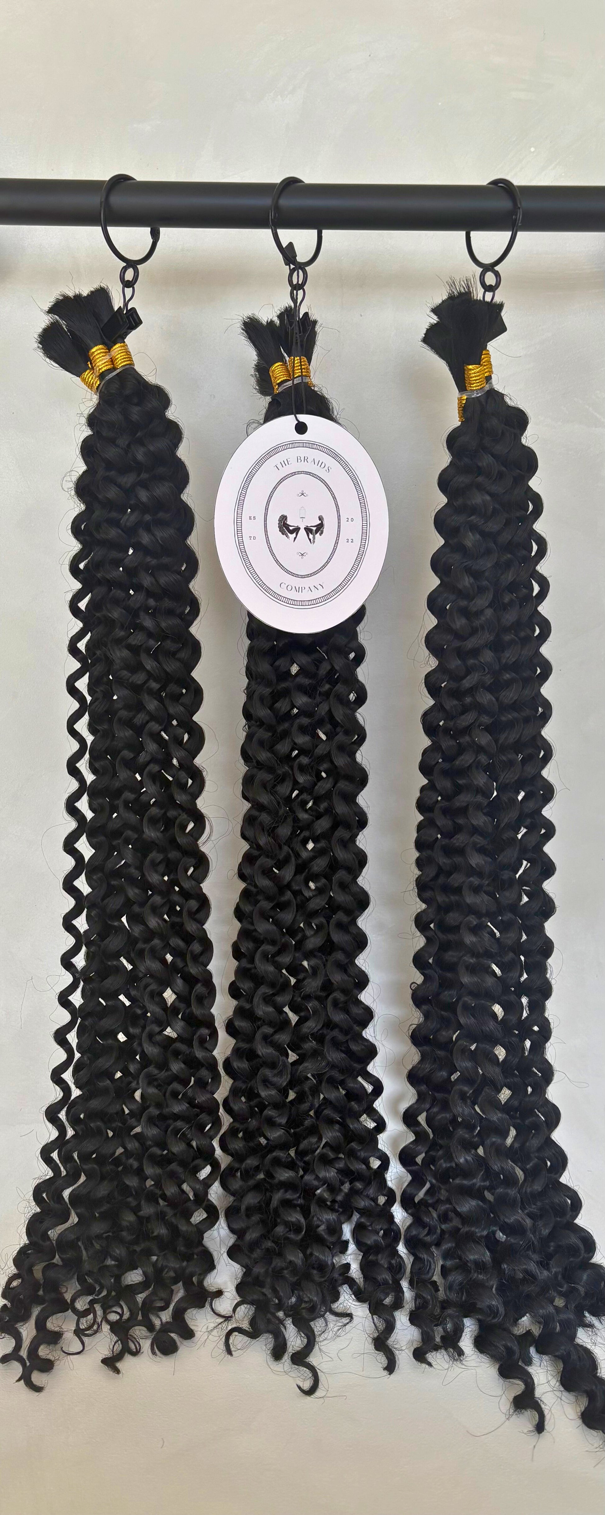 BLOOME Wet Wave Bulk Hair is a wet-look curly wave that blooms into a soft coily curls when combed. A glamorous style with high shine, it’s popular for crochet braids and adding curly ends and dimension to traditional braids.